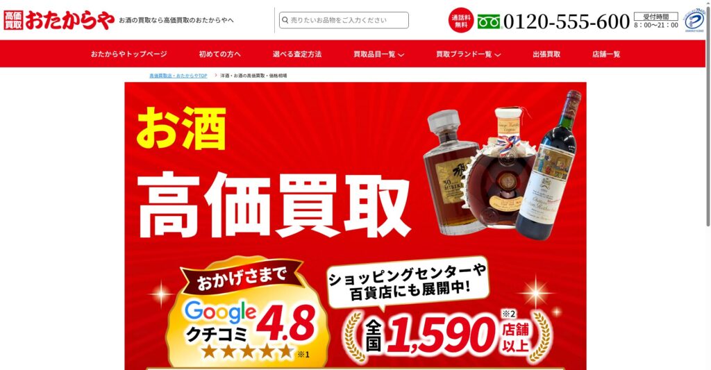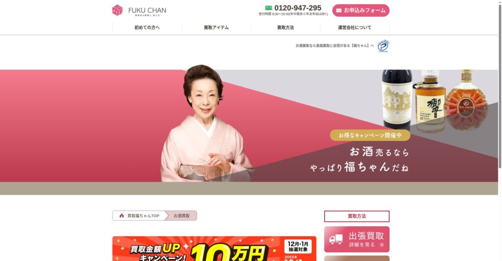 福ちゃんはテレビCMでもお馴染みの有名なお酒買取業者です。年代物のお酒や高価なお酒以外に、ボトルやラベルに傷がついたお酒も買取対象になります。お酒についての知識が深く、査定の経験が多いスタッフが査定を担当するので査定額にも納得。お酒の販売ルートも豊富で、業界でもトップクラスの高価買取が期待できます。