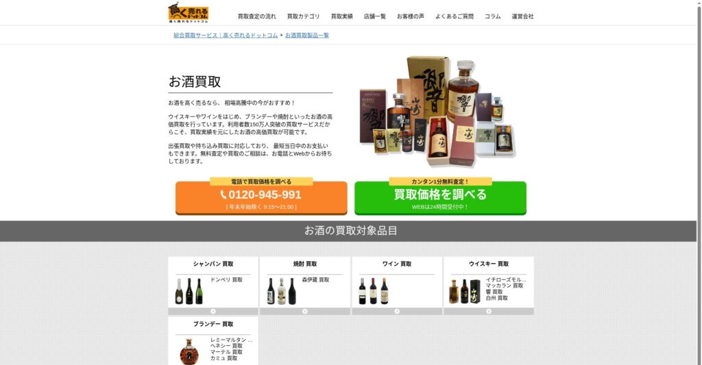 高く売れるドットコムは、全国展開しているお酒の買取業者です。焼酎や日本酒、ウィスキー、ブランデーやシャンパンなどを買取しています。1本からでも買取は可能で、気軽にお酒の買取を依頼できるのが嬉しいポイント。手数料はすべて無料、事前査定制度で他社との相見積もりを取れるなど、細かなサービスを受けられます。