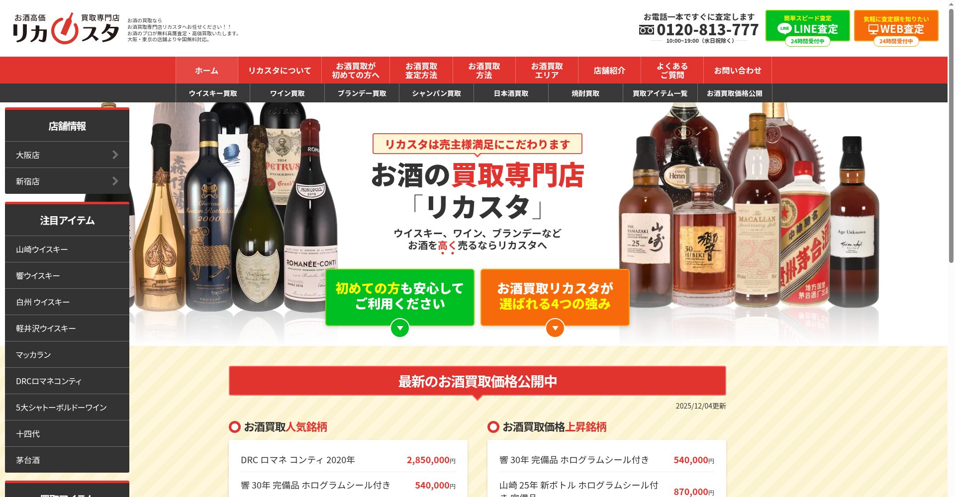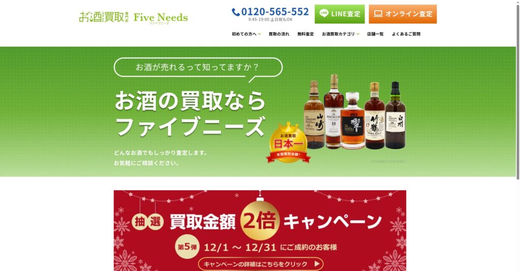 買取リカーズは、お酒専門の買取店です。専門店だからこそお酒への知識が深く、高価買取が期待できます。さらに、今なら年末の買取額アップキャンペーン中で、査定額20%アップ+最大5万円上乗せのチャンス。Yahoo!からも急上昇ショップに選ばれるなど、多くの利用者に愛されているお酒の買取業者です。