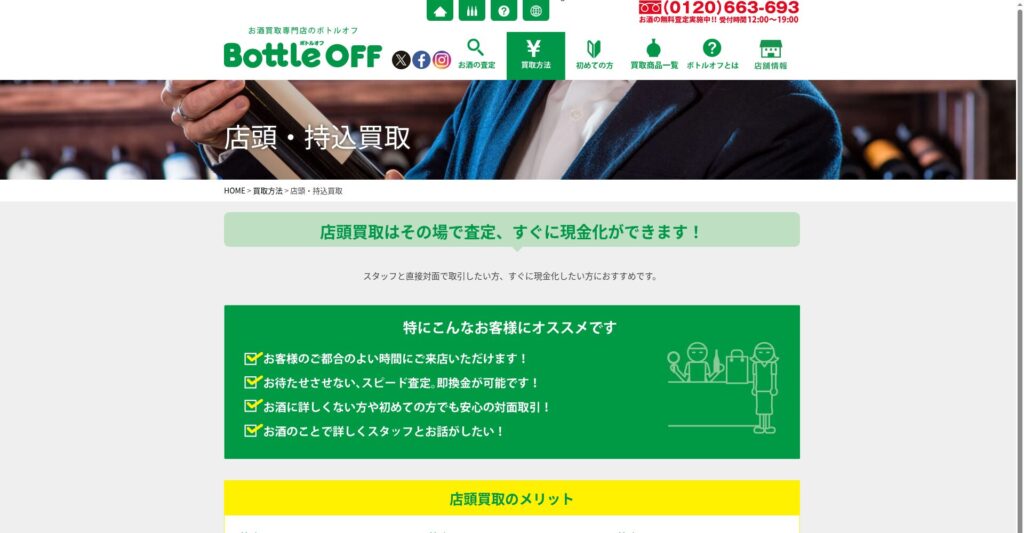 高く売れるドットコムにお酒を持ち込んで、店頭で買取してもらえます。店頭買取は予約不要でその場で査定をしてもらえるのがポイント。査定額に問題なければ、現金もすぐに受け取れます。