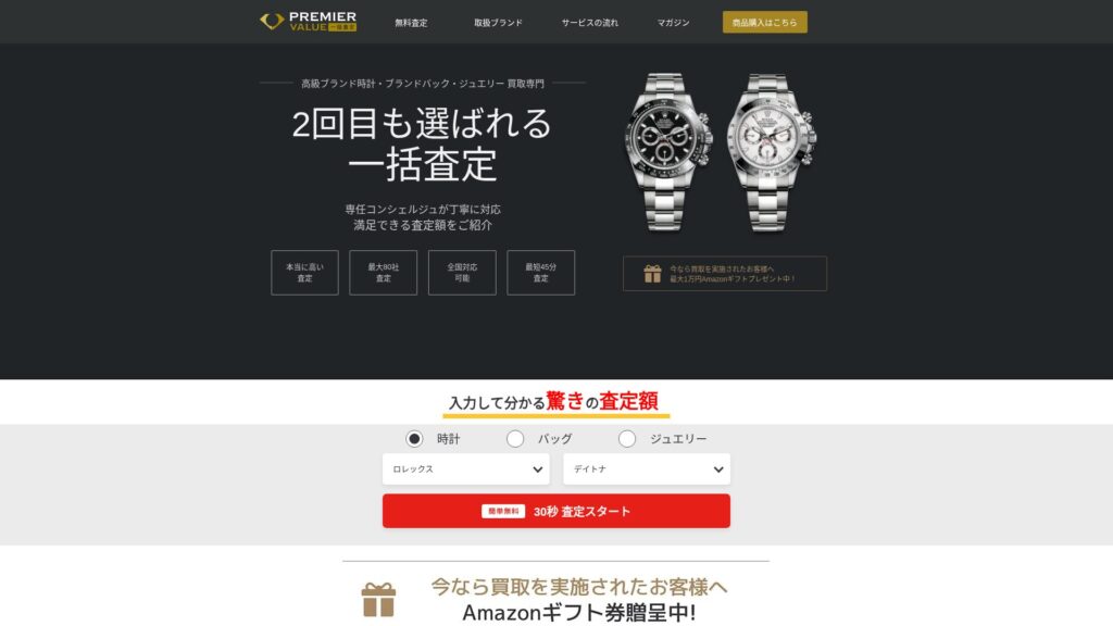 | おすすめポイント ・腕時計やジュエリー・ダイヤなど貴金属の専門店だから査定の眼も確か ・最短5分で査定が出るので待ち時間がなく忙しい方も利用しやすい ・査定額が上がる下取り制度やUターン買取なども利用できる |