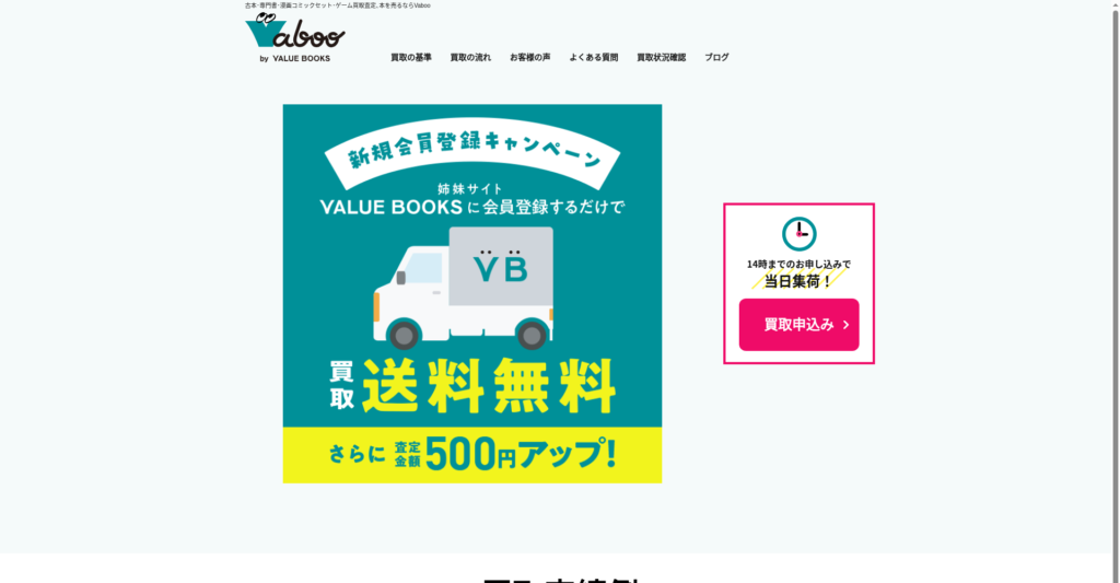 Vabooは、バリューブックスの姉妹店の漫画買取業者です。バリューブックスに会員登録をすると、配送料が無料になり、また査定額が500円UPするキャンペーンを展開中。Vabooは会員登録不要で利用できるので、面倒な方はすぐにでも漫画を手放せます。