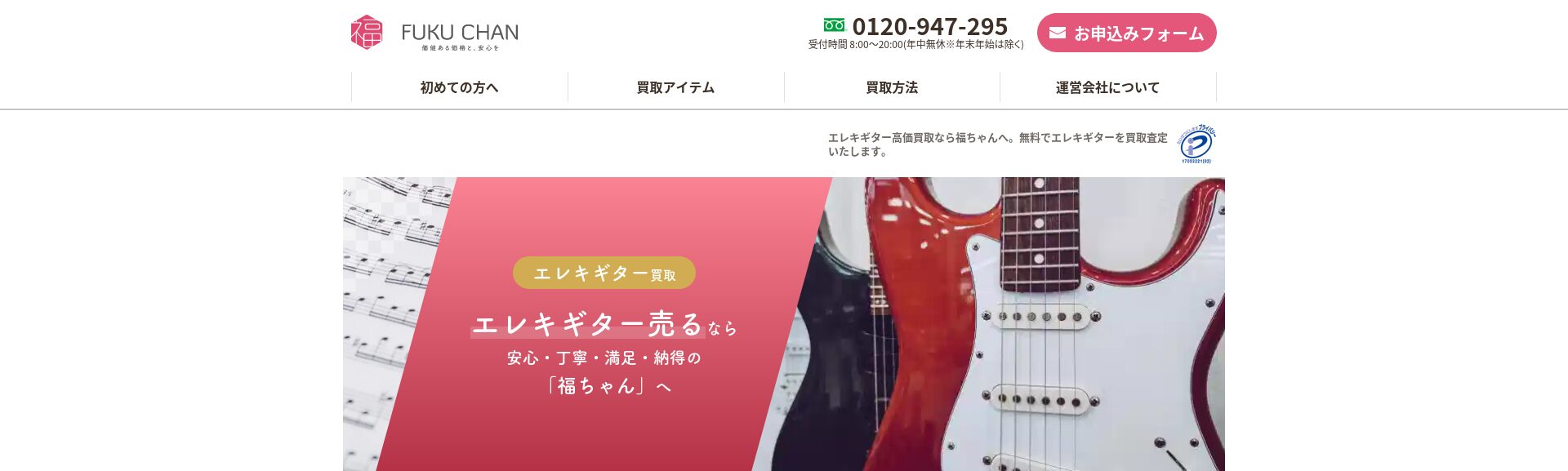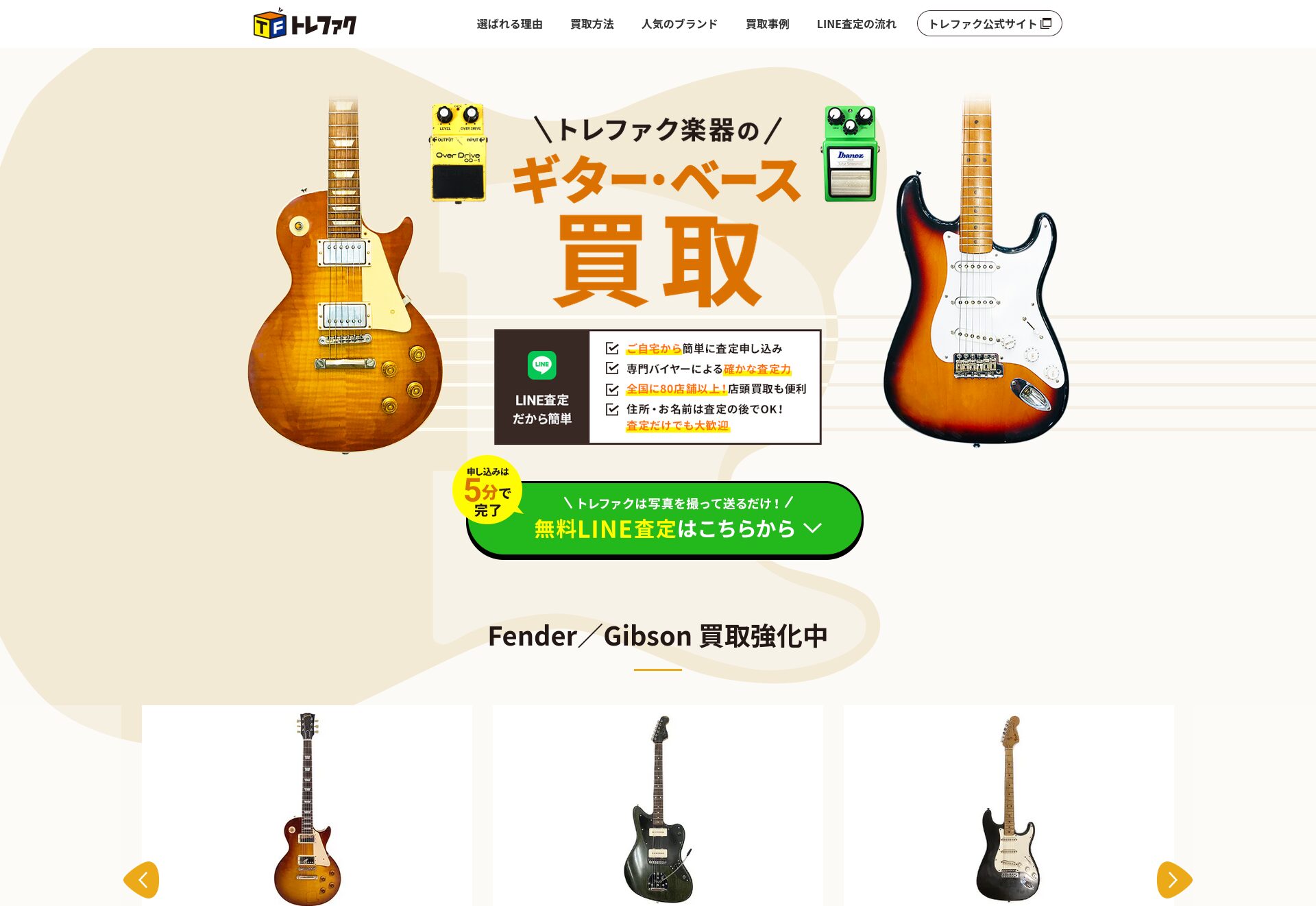 「福ちゃん」は幅広いアイテムを取り扱う買取業者で、大手ならではの豊富な実績があります。特にGibson(ギブソン)、Fender(フェンダー)、Gretsch(グレッチ)特にを強化買取中です。