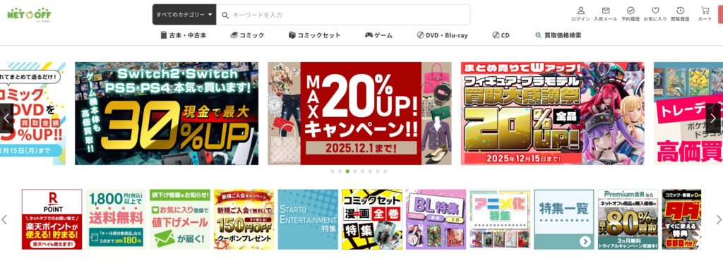 ネットオフは上場企業が運営する宅配買取店で、大手ならではのきめ細かいサービスが特徴です。買取対応ジャンルは漫画やゲームなどのほか、ブランド品など幅広いです。さらに利用でVポイントが貯まるので、日頃Vポイントでお買い物をされる方にとってはかなりお得でしょう。