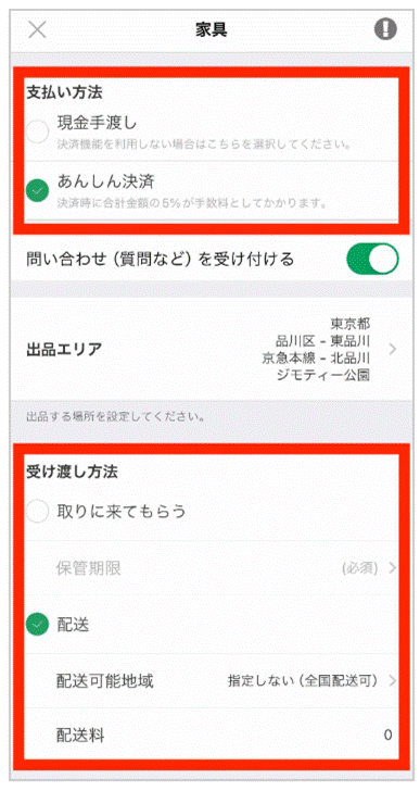 オンライン決済を利用するには、出品者が支払い方法を「あんしん決済」に設定します。現金手渡しで登録した商品を、あんしん決済に変更することもできます。