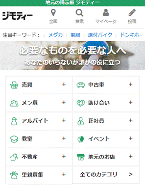 ジモティーはwebからもアプリからも登録可能。カテゴリ検索、キーワード検索、エリア検索に対応しています。