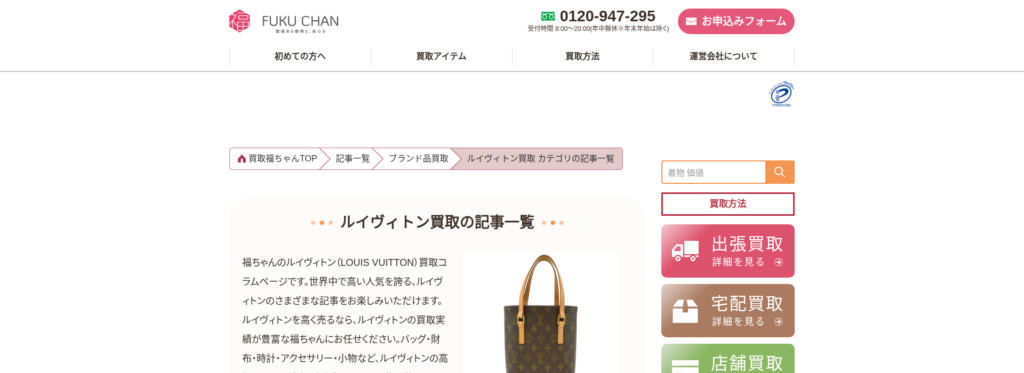 福ちゃんは業界トップクラスの価格でルイヴィトンを買取している業者です。老舗かつ大手の買取業者で、買取のシステムや鑑定士のレベルが高いので安心。査定にかかる一切の費用は福ちゃんで負担するので、万が一買取が不成立になった場合でも、依頼者に請求は発生しません。