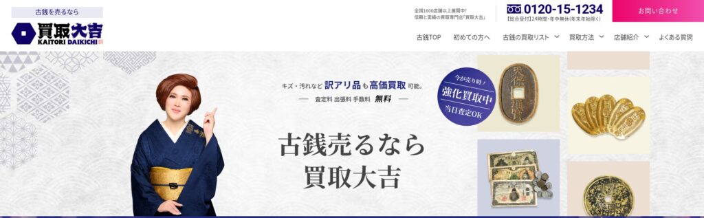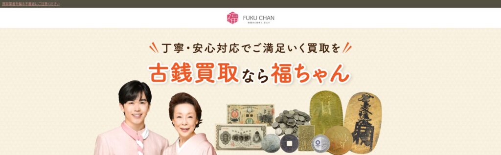 福ちゃんはあらゆる古銭や記念硬貨の買取に対応している買取業者です。全国的に知名度のある有名業者で、サービスの質や査定士の実施も豊富。これまで多数の古銭を買い取った実績があり、中には10万円以上の値が付いた古銭も。古銭以外に貴金属や着物などの買取も可能で、まとめて自宅の断捨離や整理をしたい方におすすめです。