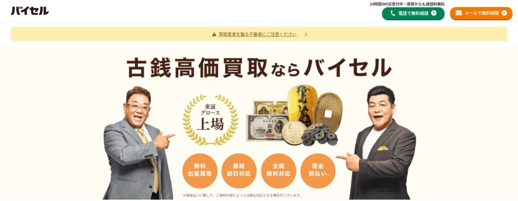 バイセルは上場企業が運営する古銭買取業者です。2015年から2023年までの間に3,700万点以上の買取実績を誇り、知名度もバッチリ。大手企業だけにスタッフの質も良く、古銭の知識をつけた査定士が古銭を鑑定します。古い古銭や汚れがひどいものでも無料査定してもらえるので、まず価値を知りたいだけの方も利用しやすい古銭買取業者です。