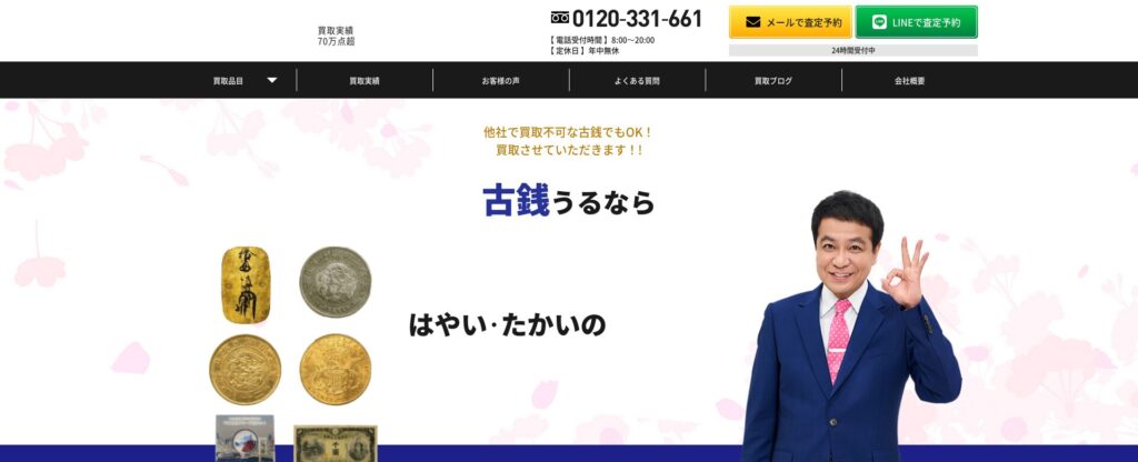 出張買取は即日対応も可能!ネットで24時間いつでも申し込みができるので、忙しい方でも利用しやすい古銭買取業者です。