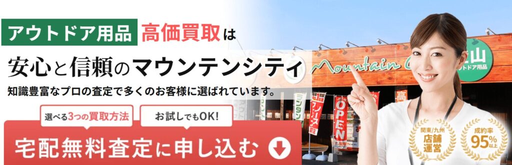 「マウンテンシティ」は、アウトドア用品全般を取り扱う買取業者で、店舗・出張・宅配の3つの買取方法から選べます。