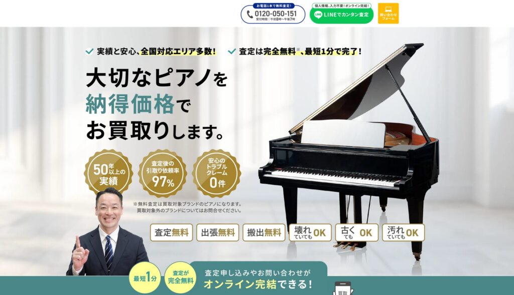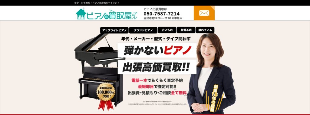 | おすすめポイント ・専属査定士がつくので安心 ・ビデオチャット査定や出張査定に対応 ・ピアノ以外にも幅広い楽器の種類に対応 |