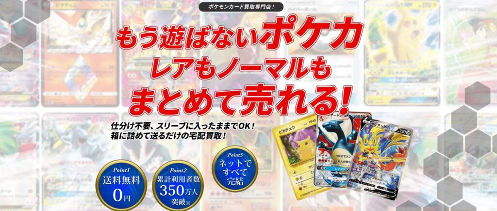 ネットだけで、ポケカを売却できますし、累計利用者数も350万人以上いますので、安心して取引できるでしょう。