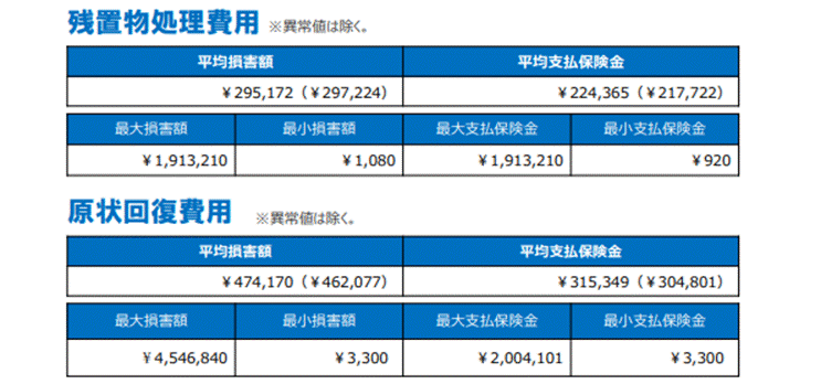 また原状回復費用は平均損害額474,170円に対し、平均支払保険金は315,349円。実質負担額は平均158,821円です。