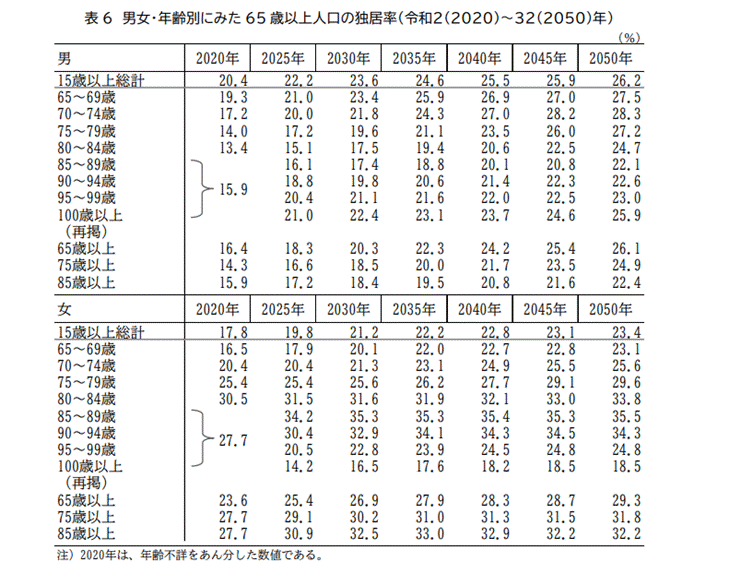 国立社会保障・人口問題研究所が2024年に発表した将来推計によると、2020年から2050年にかけて、日本の高齢者の独居率は大きく上昇することが予測されています。