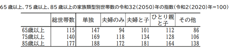 とくに注目すべきは、75歳以上の高齢者における単身世帯の増加です。2020年時点では、75歳以上の高齢者の約4人に1人が独居でしたが、2050年にはそれが約3人に1人にまで増える見込みです。