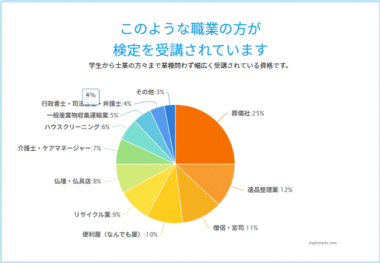 遺品の供養を通し、深い悲しみを抱えた方々の心のサポートまで行えることから、葬儀社や遺品整理業のみならず、僧侶や宮司、弁護士や介護士といった職業の方々も、資格を取得しています。