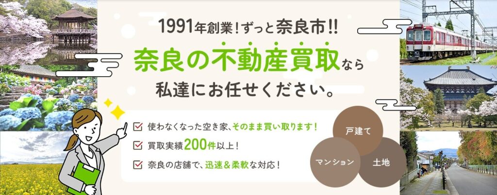 奈良の売却実績・買取実績、多数有り! お客様に寄り添い、スピーディーに対応させていただきます。 空き家・空き地・不動産のご相談は、『奈良市不動産買取センター』にお任せください。 地元出身者や女性スタッフも在籍し、売主様のご相談には宅建士が必ず対応いたします。 即日対応や現金買取など、迅速なサポートにも力を入れております。