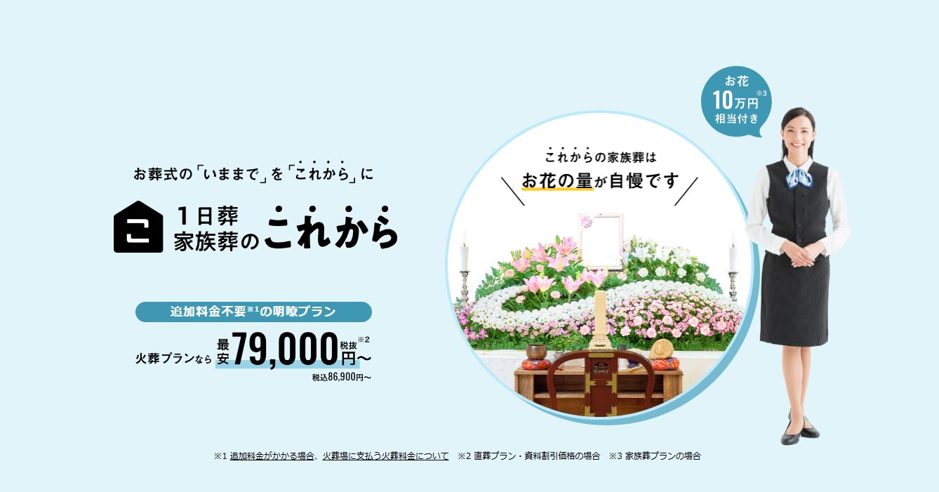 1日葬・家族葬のこれからは、いままでの高額になるお葬式の常識から、これからの時代に合う「適切規模・価格」をコンセプトに、全国の大手葬儀社と提携し、セットプランでのお葬式を提供しているサービスです。依頼・相談は24時間365日受け付けているので、興味をお持ちの方はぜひお気軽にご相談してみてください。