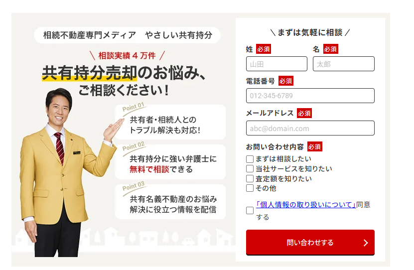やさしい共有持分は、共有名義の不動産トラブルでお悩みの方向けに、共有持分の専門家がお役立ち情報の配信やトラブル解決をサポートするサイトです。相続に強い社内弁護士や司法書士、税理士等の専門家監修のもと、正しい情報を分かりやすく届けることを使命として運営しております。